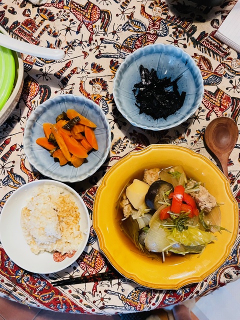 大豆ミートハンバーグは半分しか食べられないけれど、薄味ポトフでホカホカ。
